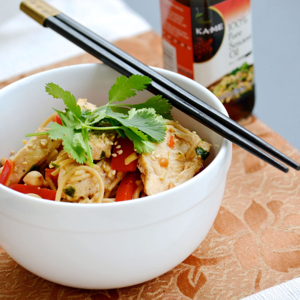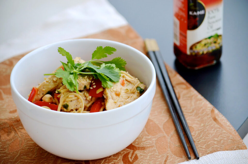 In a large bowl, toss shredded chicken with noodles, dressing, bell peppers, peanuts, scallions, cilantro and sesame seeds. Taste and adjust seasoning if necessary. Serve immediately.