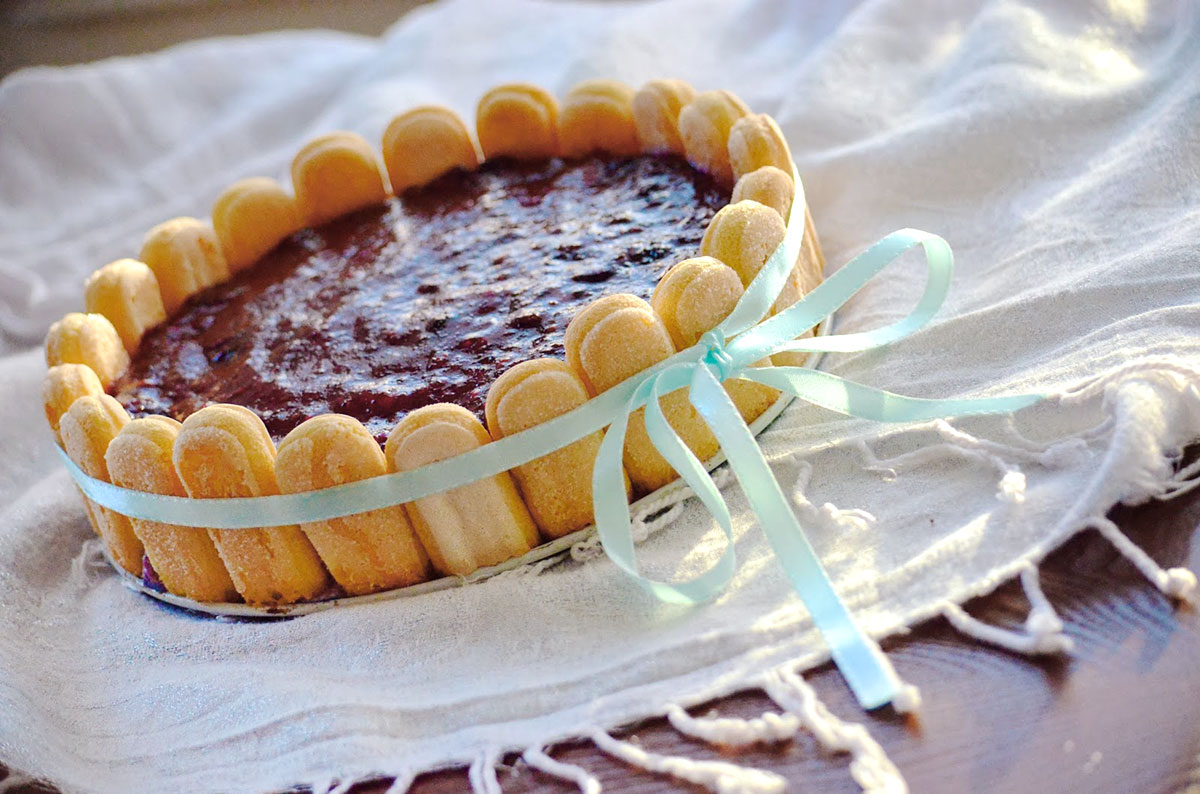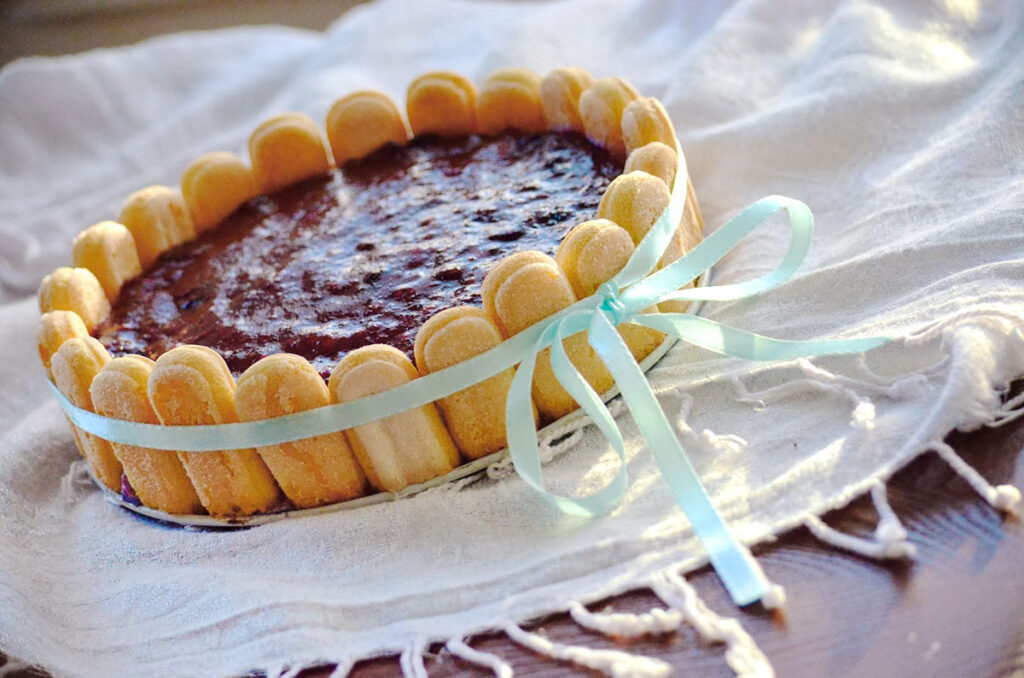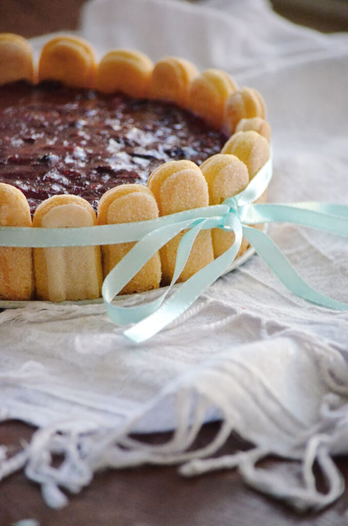 I held my breath when removing the springform sides, but it stayed up nicely. I had a lot of fun taking these pictures. Tying the satin ribbon was the hardest part out of the entire charlotte making process but I managed to get it eventually.