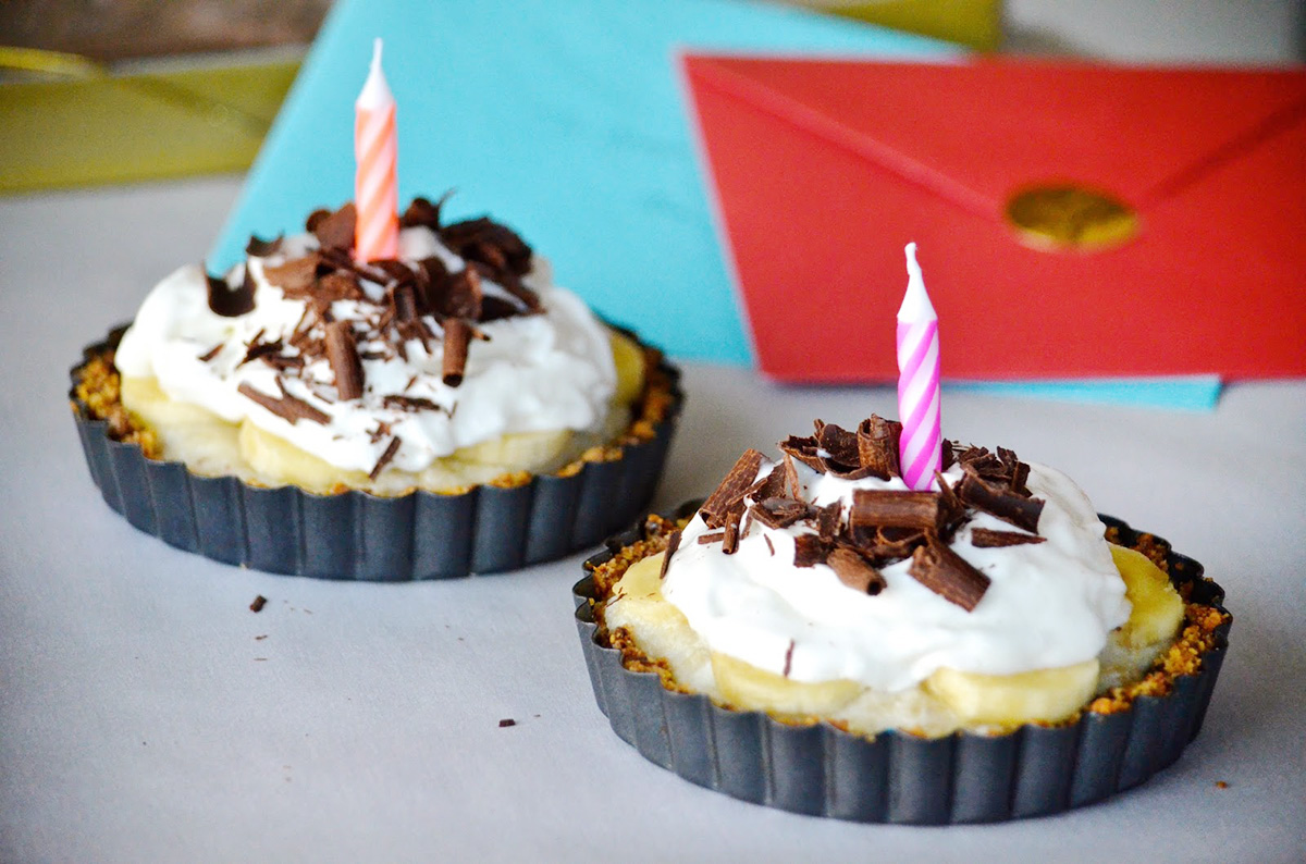 Since my birthday is here, I knew I needed a birthday dessert. I blame B, he told me I had to take time off to “relax and bake.” I had a ton of ripening bananas, so I wanted to remake this coconut banana cream pie recipe using my tart tins.