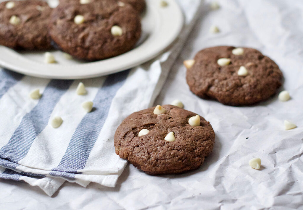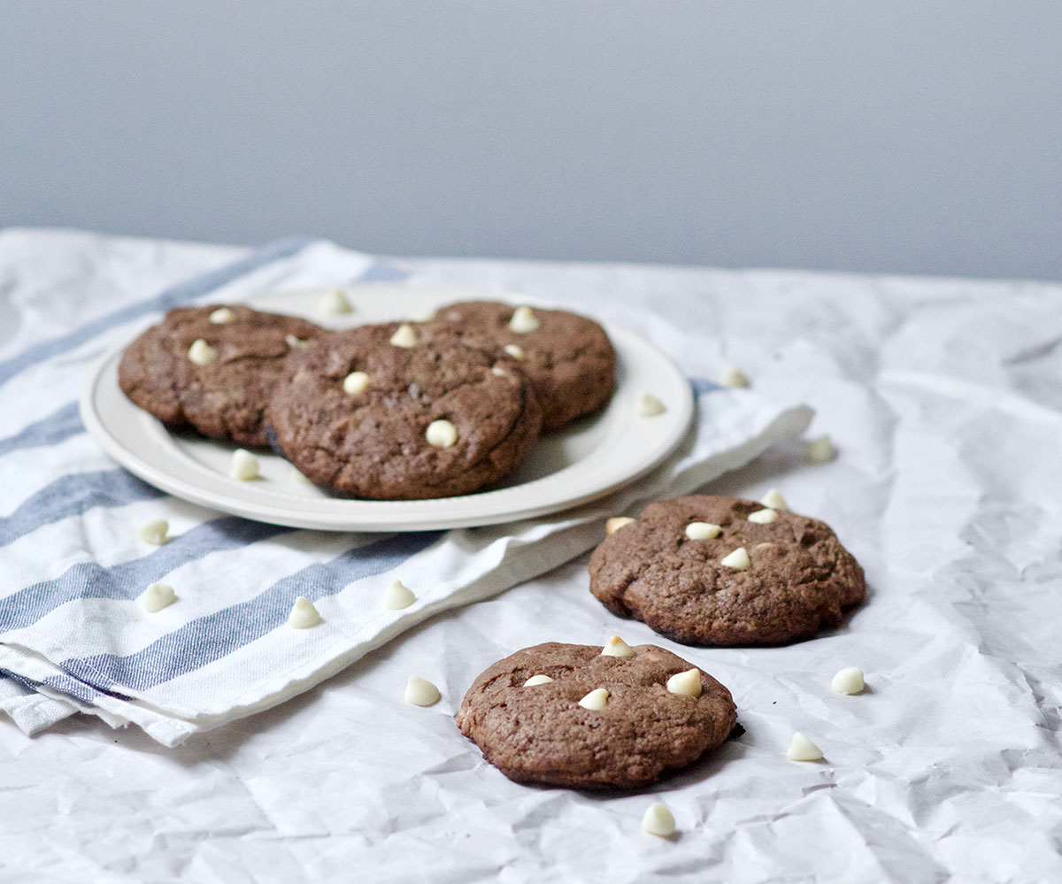 With an electric beater, cream the butter and both sugars until light and fluffy. Add in vanilla, eggs, and cocoa; mix well. Add the flour, baking soda, salt and hand stir until just combined (avoid overbeating). Fold in the white chocolate. Chill the dough in the freezer for 30 min of 2 hours in the fridge.