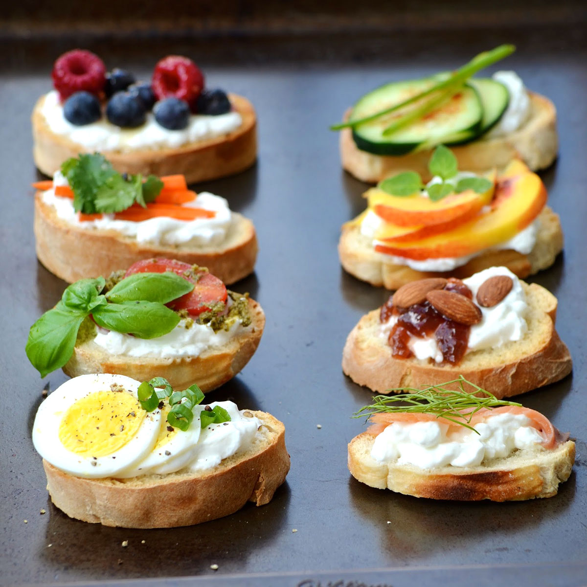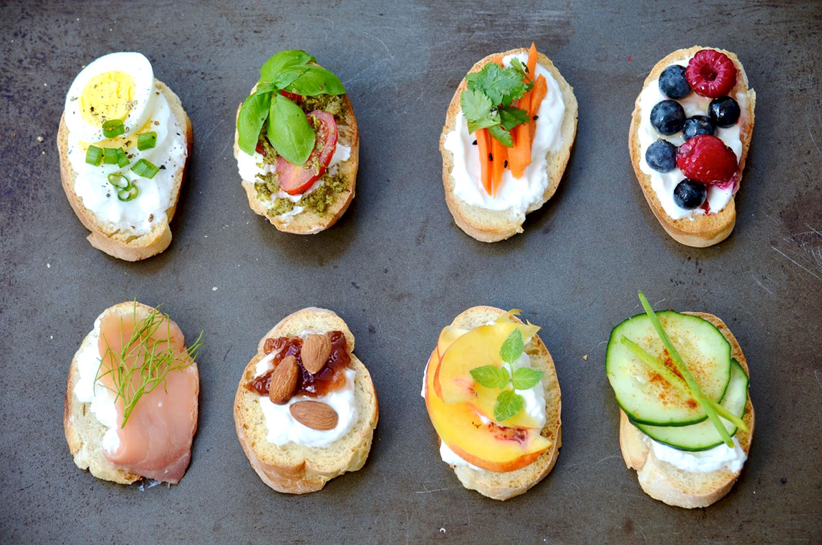 Toast your baguette slices until golden brown. Spread your Greek yogurt or cheese on top of each piece. Top with desired ingredients. Enjoy!