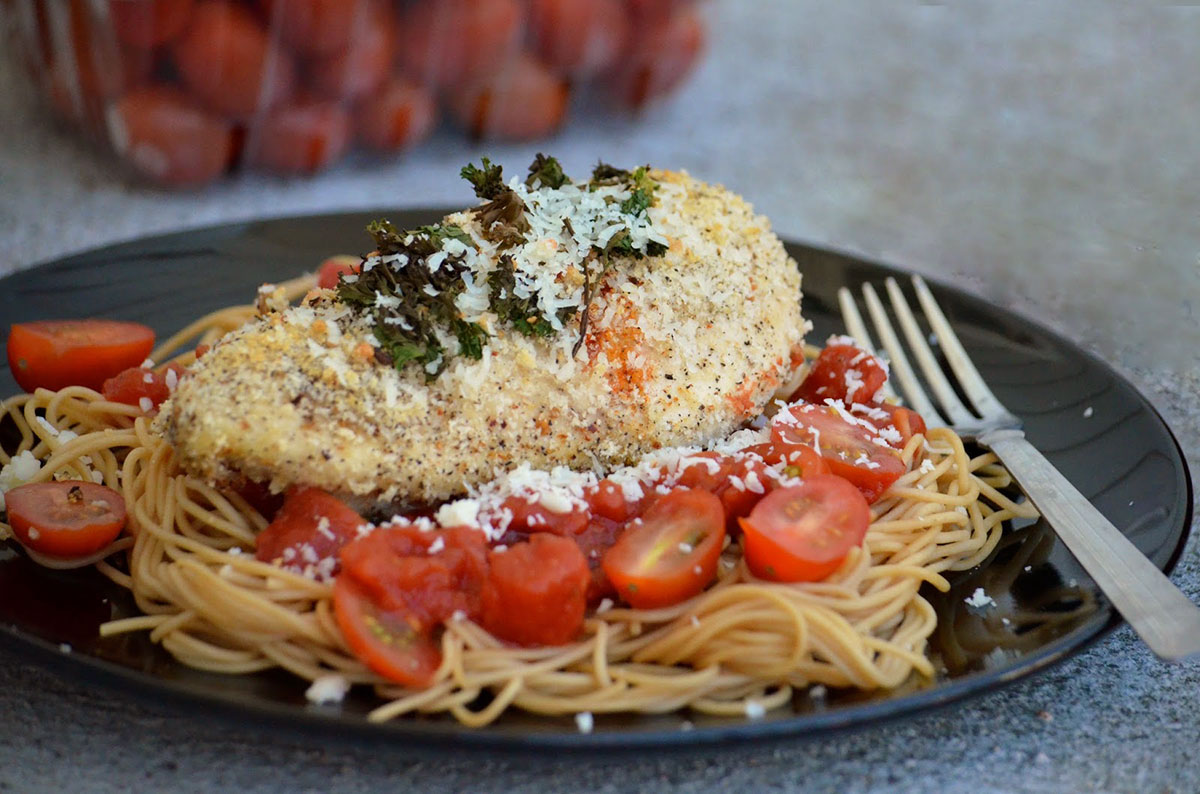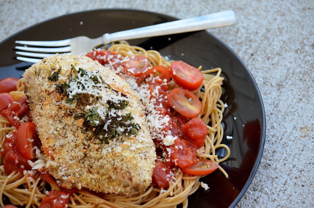 I needed comfort food after a day like today – something with carbs, cheese, and olive oil. Like this Chicken Parmesan / Parmigiana (from Allrecipes).