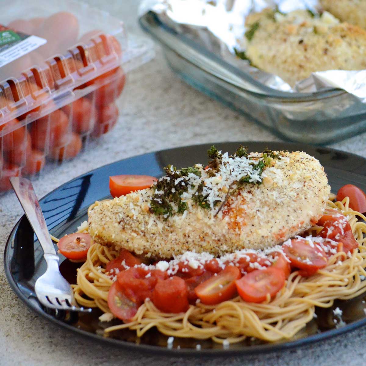 Prepare pasta and add sauce and baked chicken. Add cheese and parsley and serve.