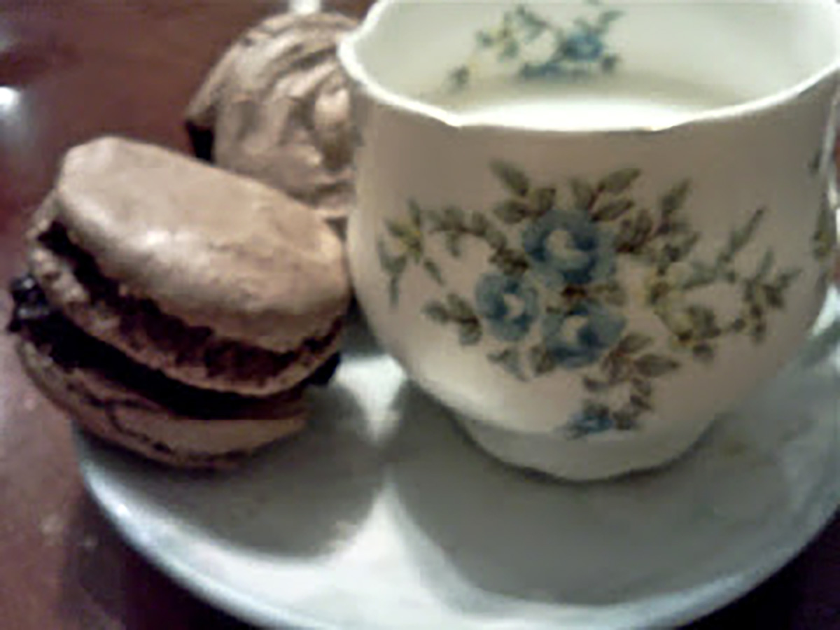 When the mixture is just smooth and there are no streaks of egg white, stop folding and scrape the batter into the pastry bag (standing the bag in a tall glass helps if you’re alone). Rap the baking sheet a few times firmly on the counter top to flatten themacarons, then bake them for 15 minutes. Let cool completely then remove from baking sheet.