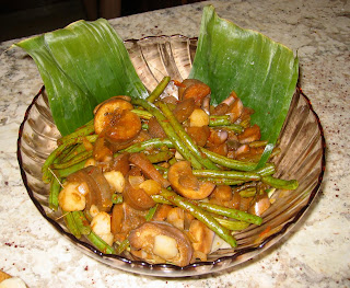 Sautee green beans and eggplant with vegetable oil, cooking wine, soy sauce. Add sambal balado chili relish (chili paste introduced to me by my neighbor, apparently chili pepper or green chili is blended together with garlic, shallot, red or green tomato, salt and lemon or lime juice, then sauteed with oil). Add water chestuts.