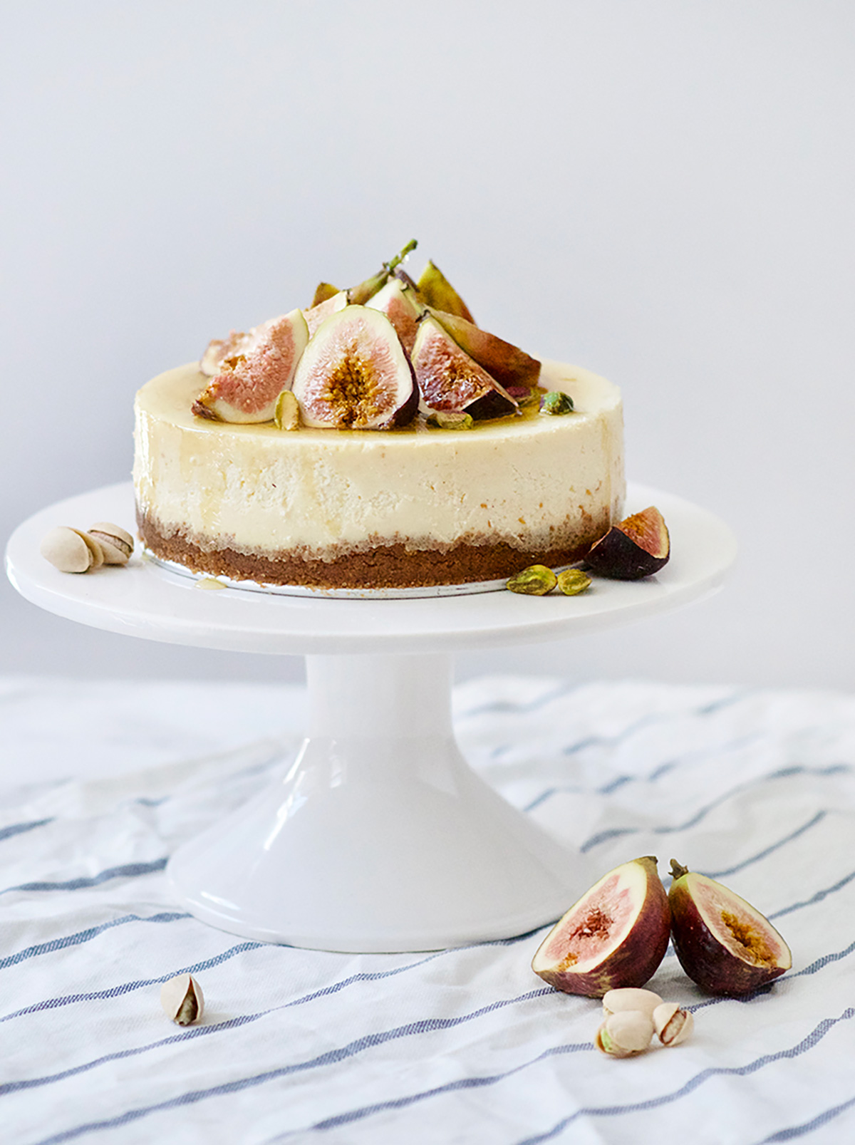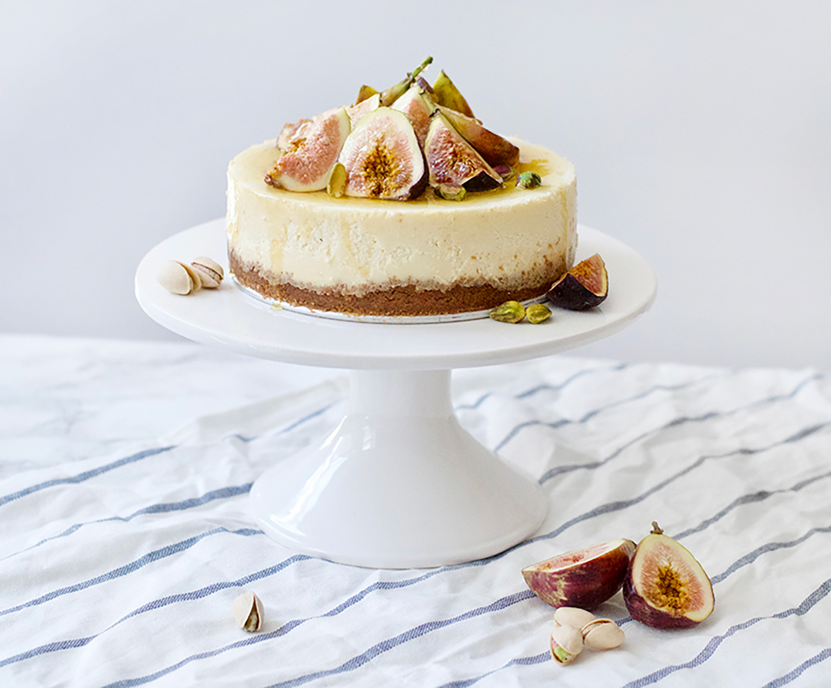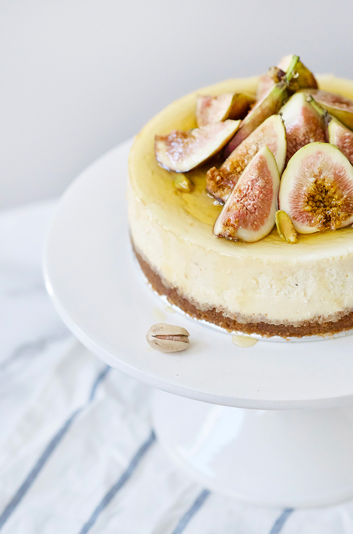 TOPPING: Cool to room temperature on a rack and then cool completely into the refrigerator. Garnish the top of the cheesecake with fresh sliced figs, toasted pistachios, and honey.