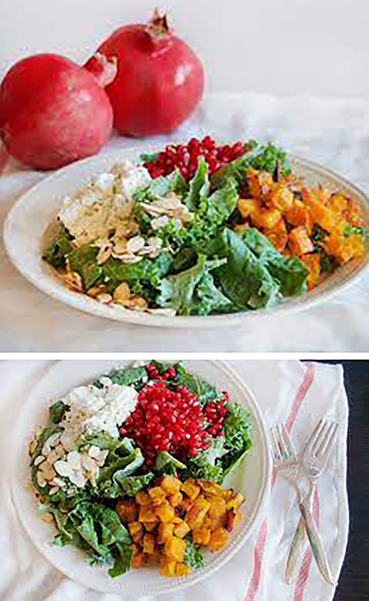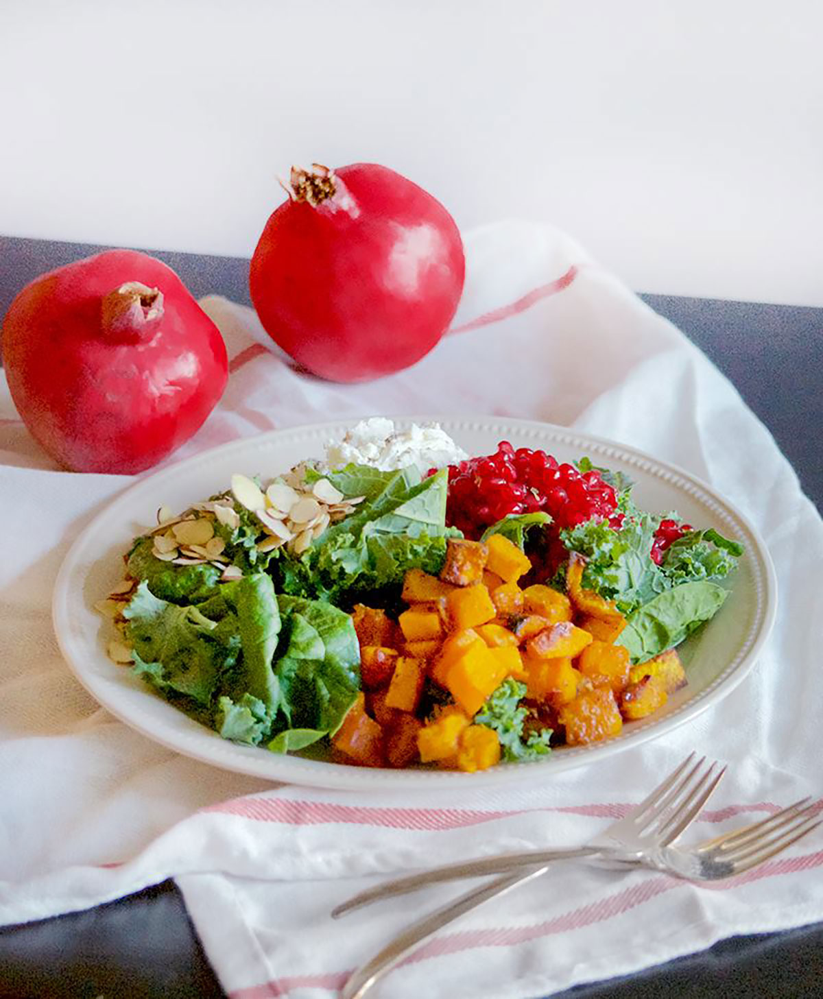 Kale Salad with Pomegranate, Butternut Squash, and Goat Cheese