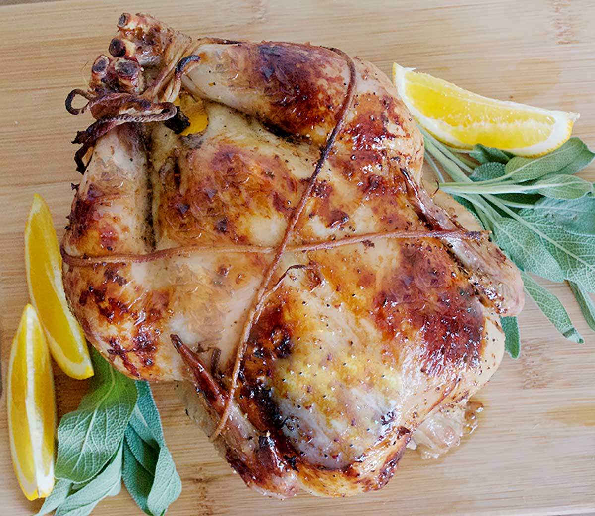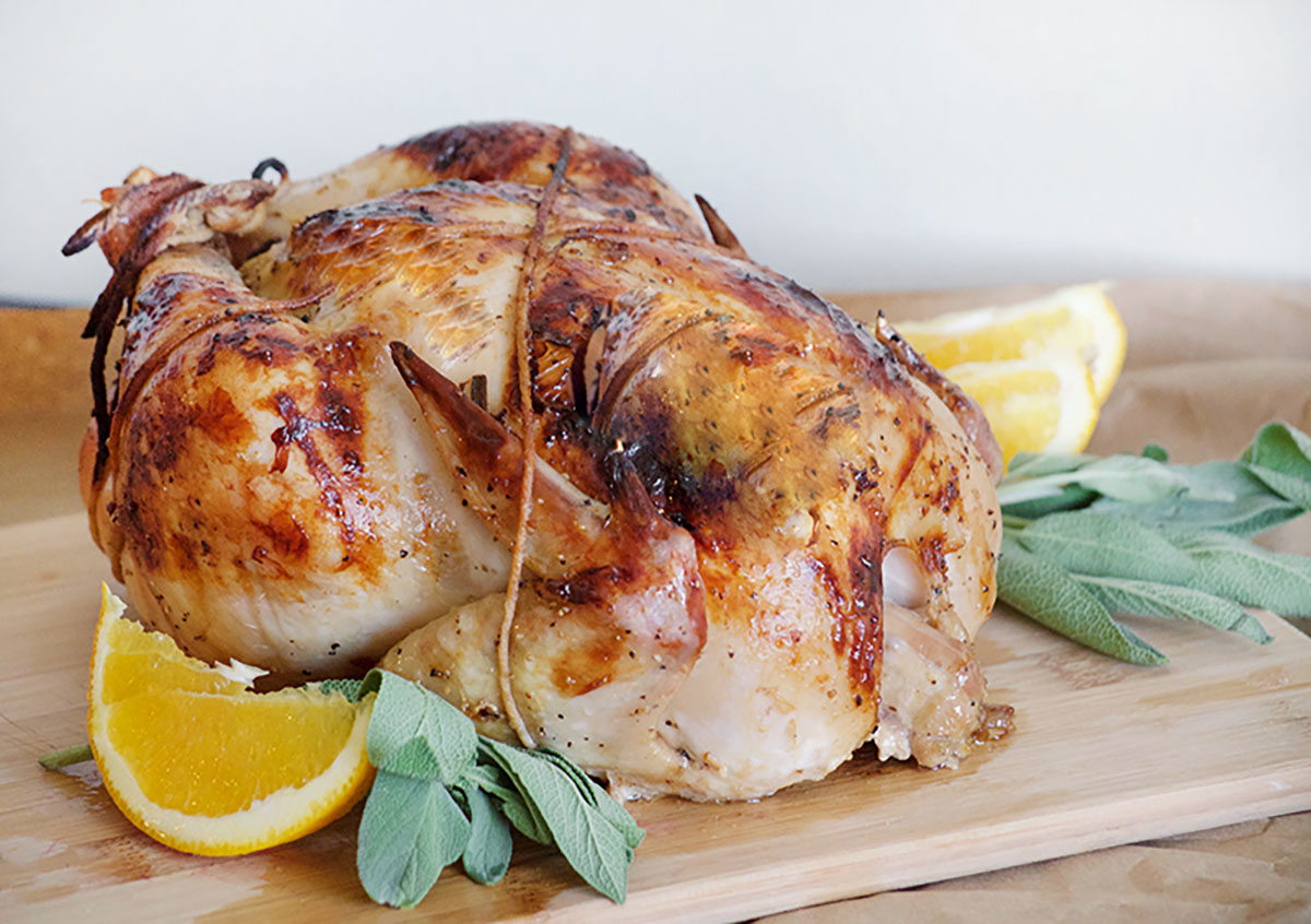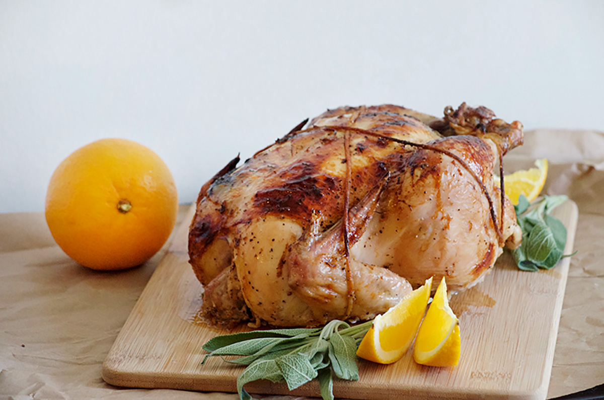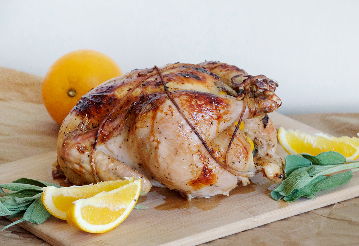 Preheat oven to 400 F. Season chicken all over, including cavity, with salt and pepper. Stuff the cavity with orange slices and sage.