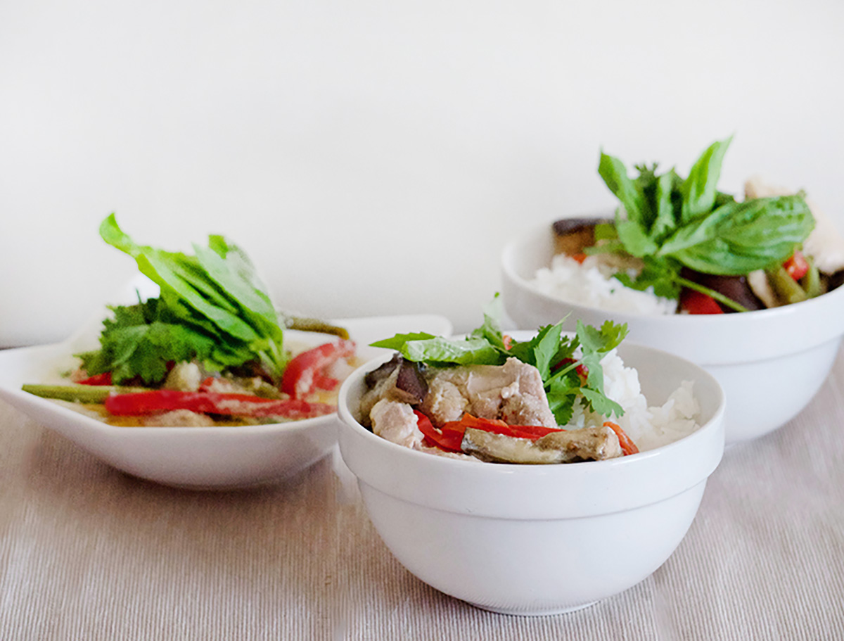 In a wok or large pan, heat the oil, and stir the garlic, curry paste, and onions for a few seconds to release all the flavors. Add the pieces of chicken, green beans, red bell pepper, eggplant and stir fry. Pour in the coconut milk and let it come to a bubble. Add the thai chili, lime juice and zest. Turn the heat down to a simmer and cook, covered, until the chicken is cooked. Once done, add basil and cilantro. Serve immediately with cooked rice, garnished with basil leaves and cilantro.